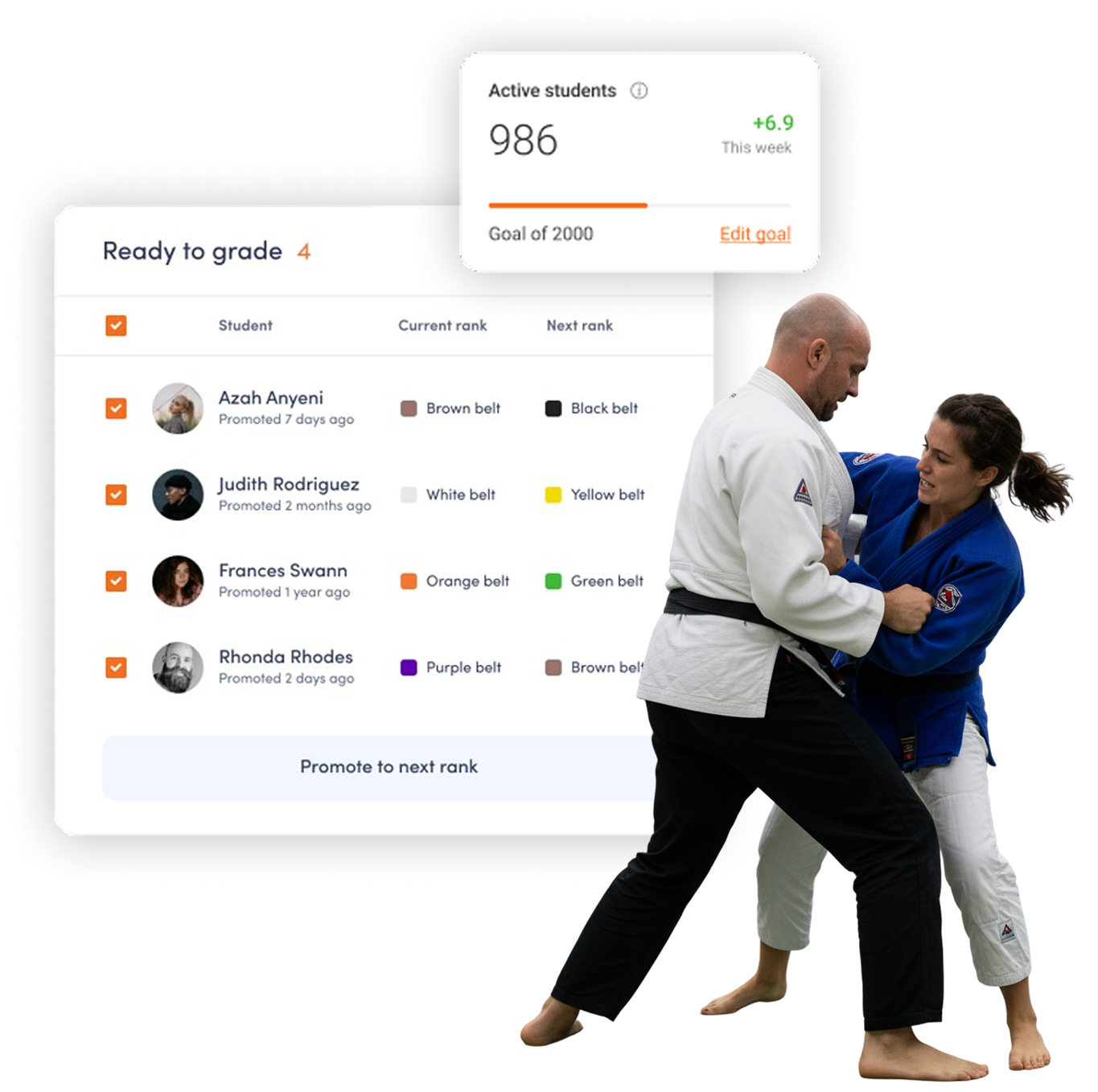 Track each member's current belt, rank, or grade - updated as they progress